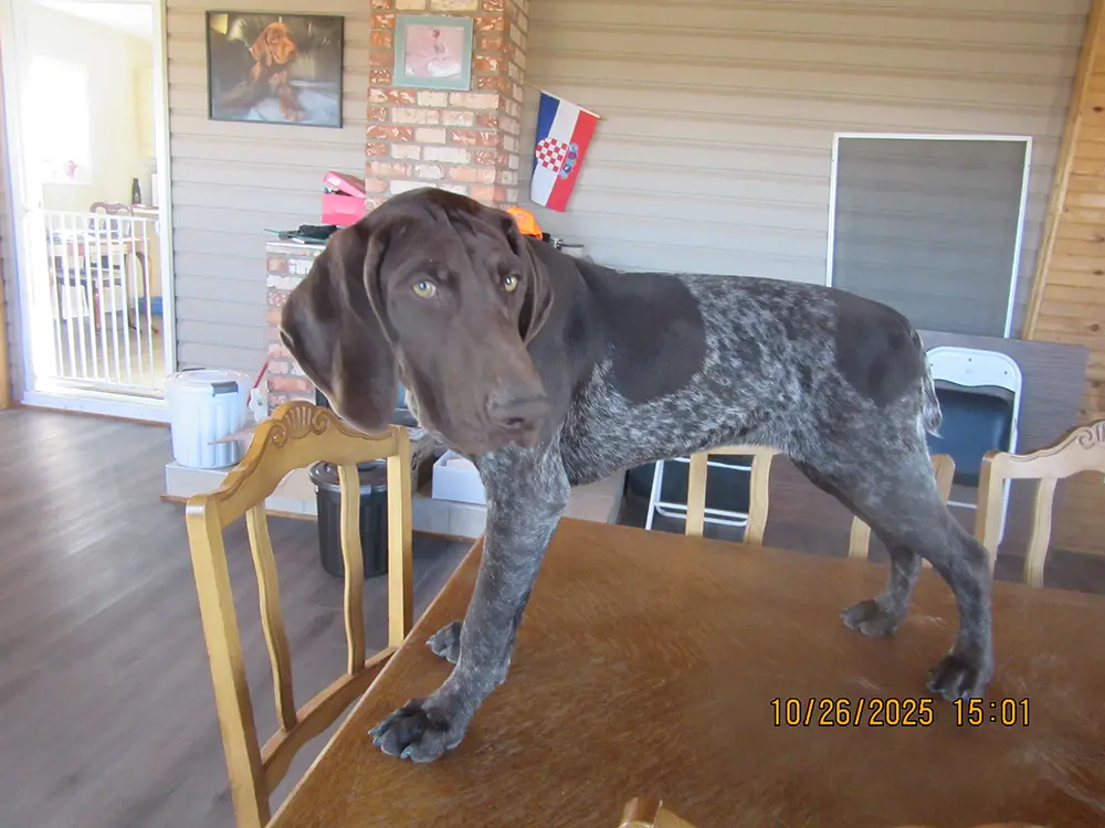GSPs are known for their energy and receptiveness to training, making them perfect for families and hunters. The pre-trained dogs showcase the breed’s intelligence and adaptability, having been socialized and groomed to be comfortable in loud settings.